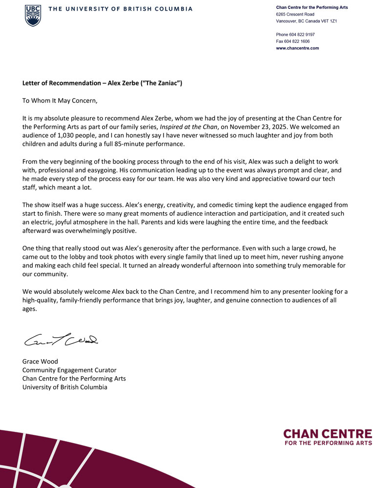 Weird, skillful, and charming, the Zaniac delivers jokes about parenthood, performs crazy tricks, and unleashes sight gags and physical comedy that will leave a trail of confetti, smiling kids, and happy parents in its wake.